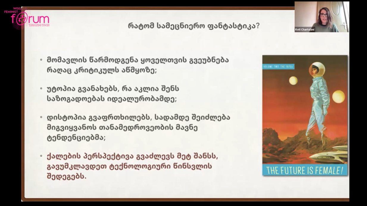 მე-V-ე ფემინისტური ფორუმის "ტექნოლოგიის ფემინისტური წარმოსახვა"-ს დროს ასევე ვისაუბრეთ ტექნოლოგიაზე ხელოვნებაში, კინოში და ლიტერატურაში. ერთ-ერთი პანელი კონკრეტულად სამეცნიერო ფანტასტიკის ჟანრს დაეთმო.